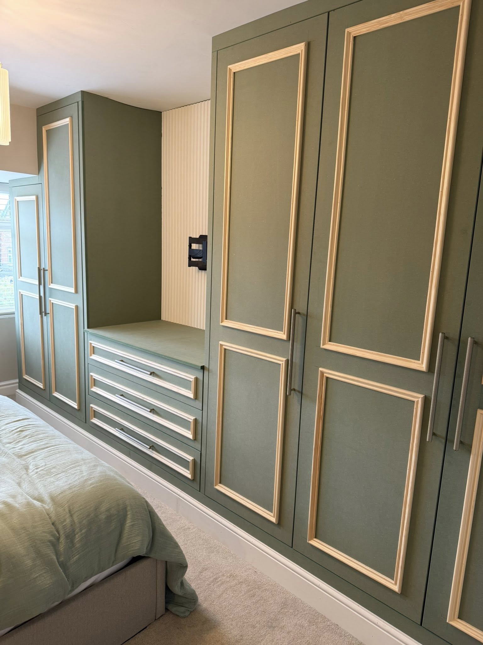 " We recently had Rhys in to build some wardrobes around a chimney breast in a bedroom. The whole process was incredibly smooth from design to build. Rhys took the time to understand exactly what we wanted and offered his professional opinion to make sure we got a result that not only looked good but was incredibly functional! We would recommend Rhys and will be having him to fit some more wardrobes in another bedroom once the room is ready. Thank you! "
